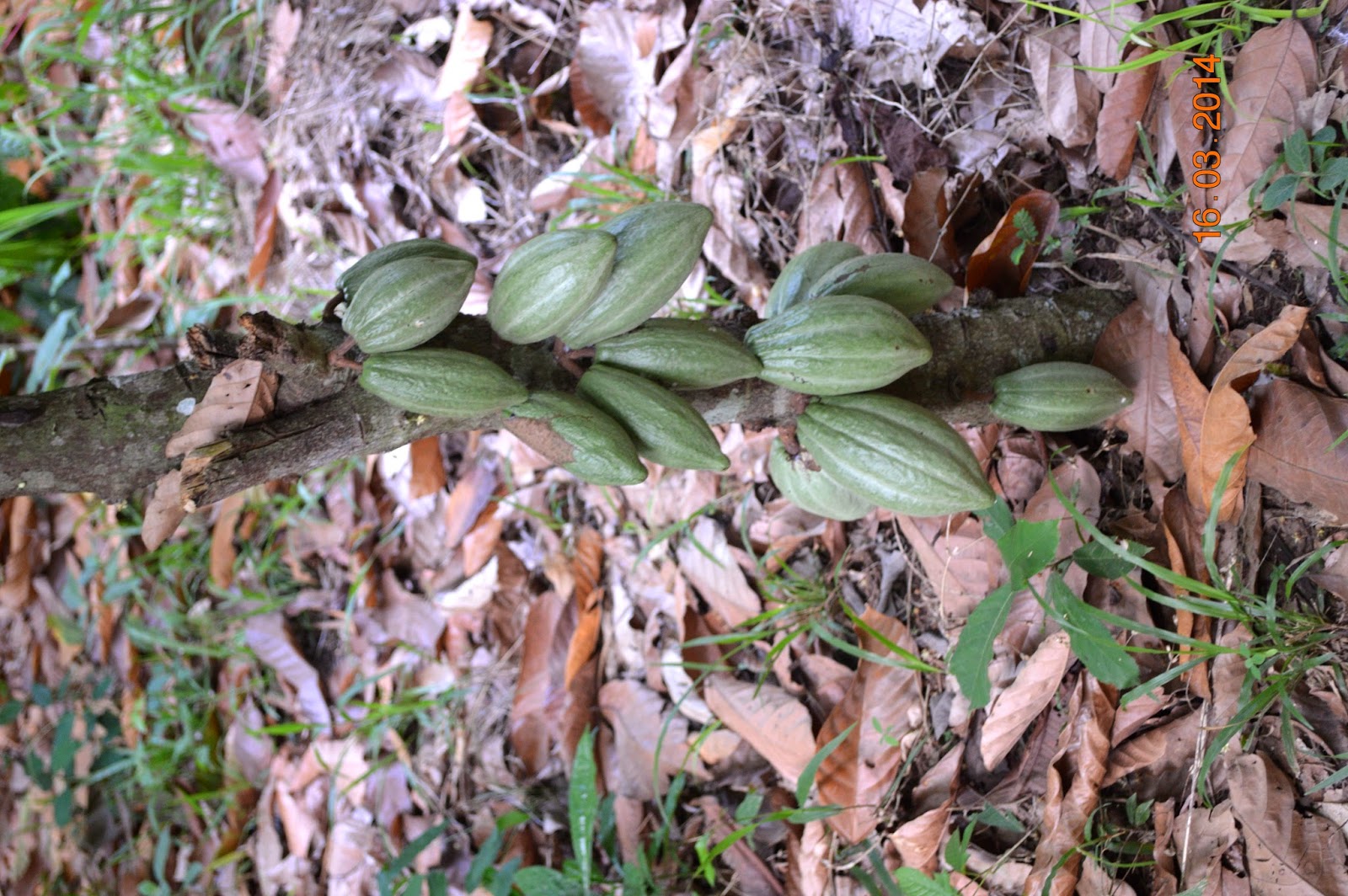 Sorry, flip the photo to the right please. The cocoa nuts are hanging down from the tree trunk. |